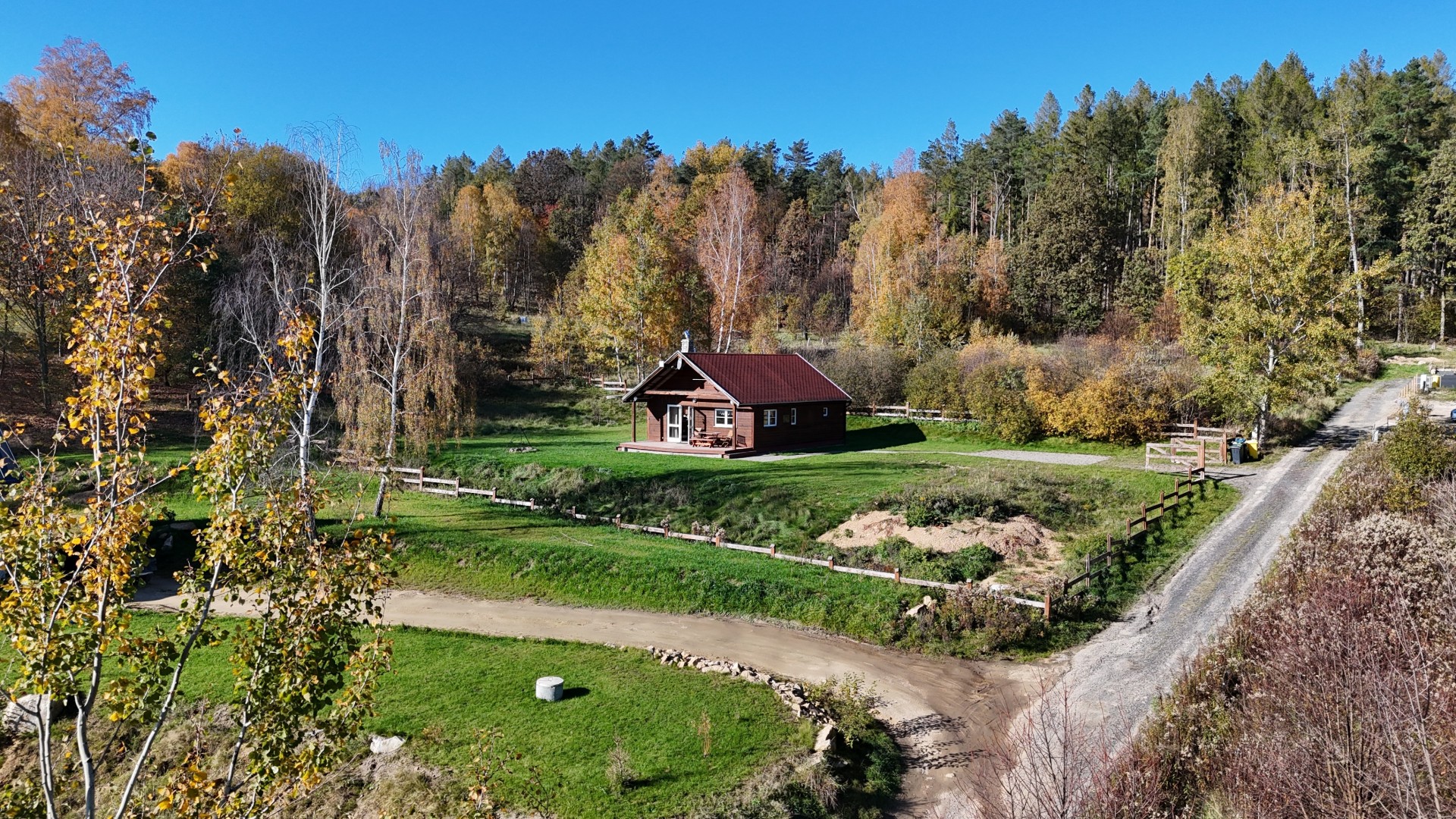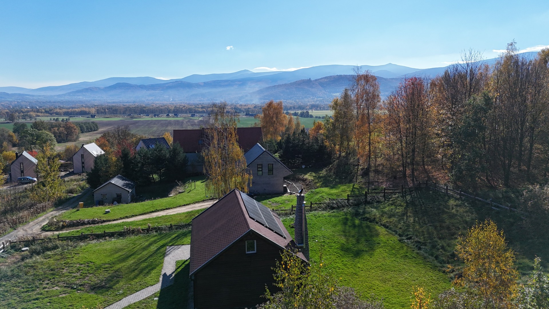 Domek jest usytuowany na dużej, prywatnej działce, oferującej spokój i przestrzeń. Widok na góry oraz zielony ogród otoczony lasem zapewniają idealne warunki do relaksu. W bliskiej odległości znajdują się restauracje, kawiarnie oraz atrakcje przyrodnicze i kulturowe.