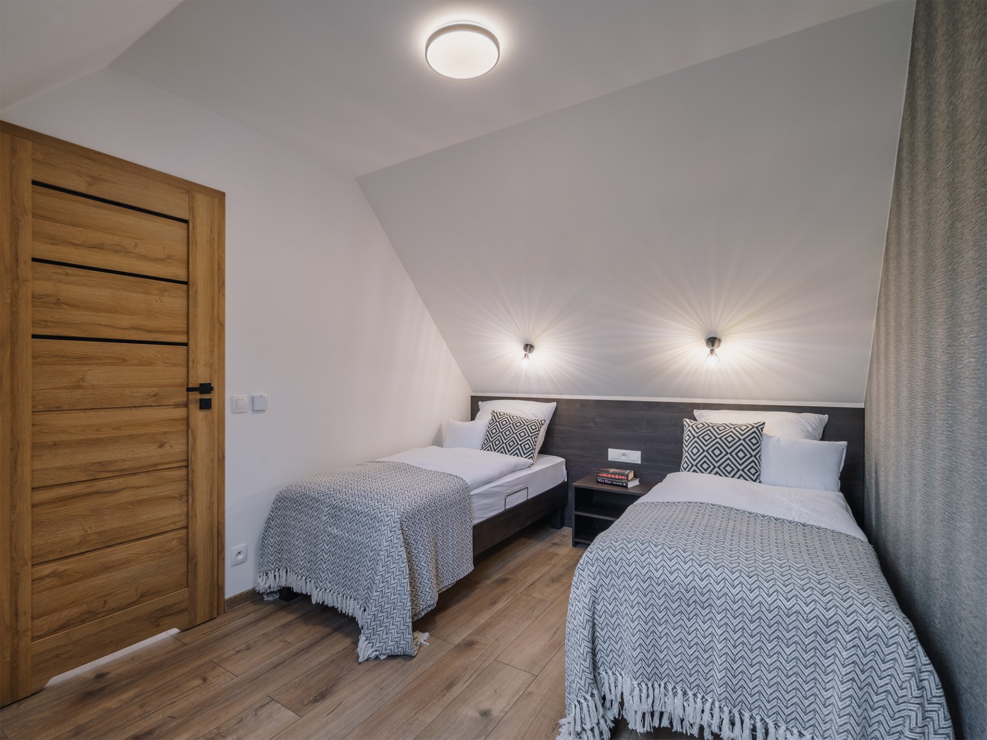 Każdy domek przygotowany jest dla 4 - 6 osób. Na parterze znajduje się komfortowy salon z rozkładaną sofą dla 2 osób, wygodny, w pełni wyposażony aneks kuchenny, łazienka z prysznicem, ręcznikami i suszarką do włosów i oczywiście TV. Na piętrze czekają na Was 2 dwuosobowe sypialnie (jedna z łożem małżeńskim, w drugiej 2 pojedyncze, wygodne łóżka). Z każdego domku wyjście na taras. Na terenie obiektu znajduje się SAUNA, wiata z grillem oraz miejsce „chilloutowo-leżakowe”