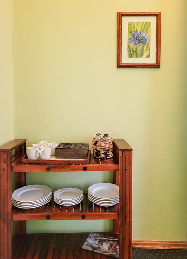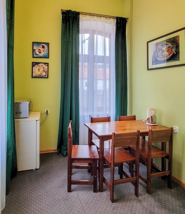 W każdym pokoju czajnik, talerze, kubki i sztućce.