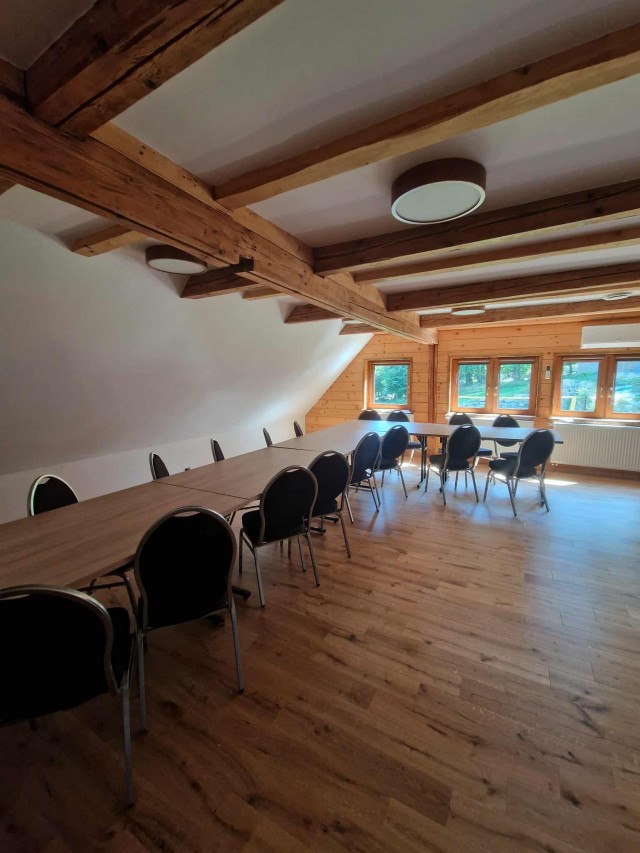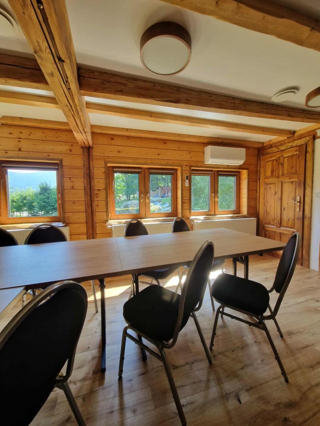 wspólna sala ze stołami dla 25 osób, kominek, telewizor z Netflixem, kącik z planszówkami i książkami, stół do ping-ponga,
